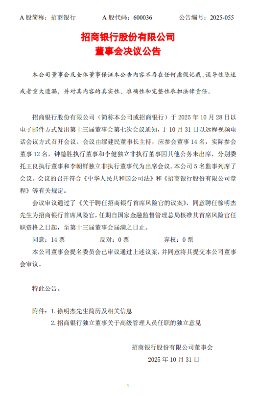 同日,招商银行发布董事会决议公告称,公司于2025 年10 月28 日以电子邮件方式发出第十三届董事会第七次会议通知,于10 月31 日以远程视频电话会议方式召开会议。会议审议通过了《关于聘任招商银行首席风险官的议案》,同意聘任徐明杰先生为招商银行首席风险官,任期自国家金融监督管理总局核准其首席风险官任职资格之日起,至第十三届董事会届满之日止。