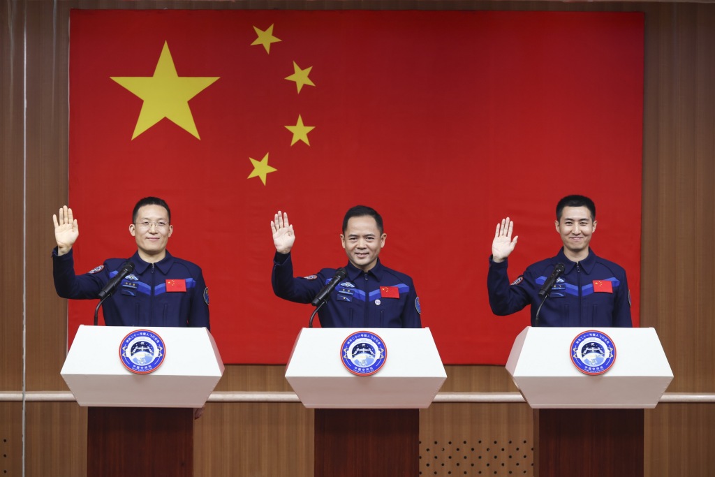 航天员张陆(右)、武飞(中)、张洪章在出征仪式上。新华社 图