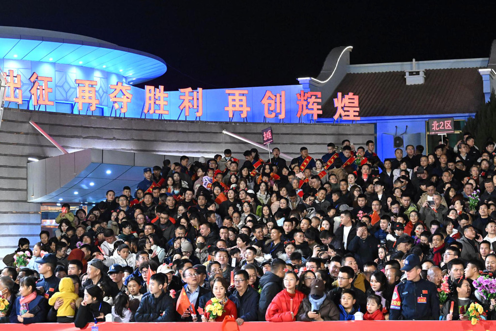 10月31日,神舟二十一号载人飞行任务航天员乘组出征仪式将在酒泉卫星发射中心问天阁圆梦园广场举行。现场观众翘首以待。视觉中国 图