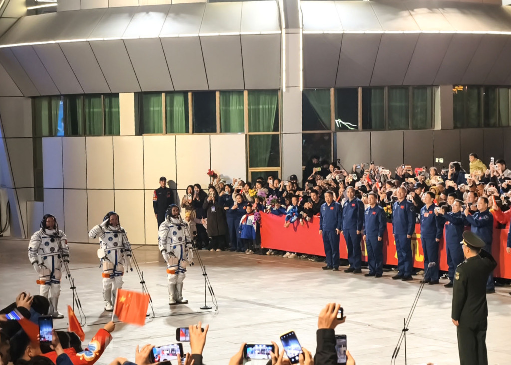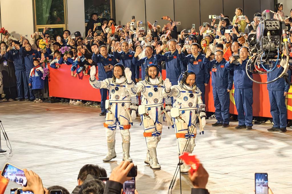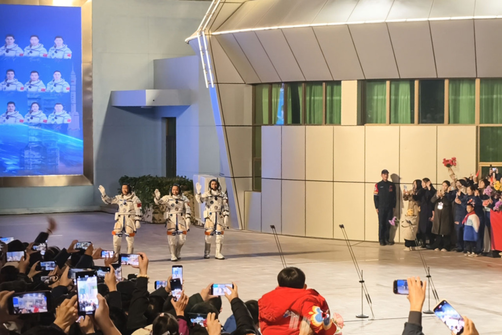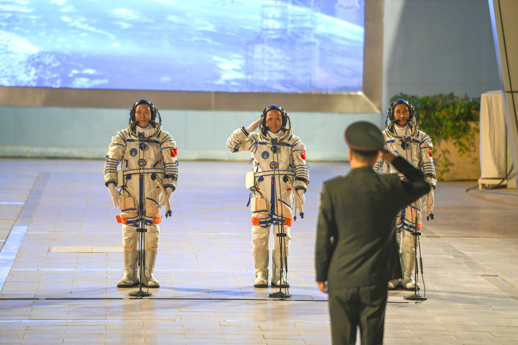 10月31日晚,出征仪式上,航天员张陆(右)、武飞(中)、张洪章向大家挥手致敬。王杰 图