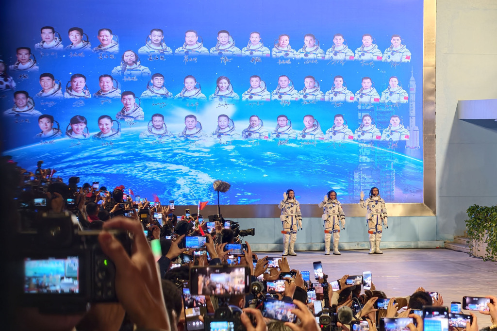 10月30日,神舟二十一号载人飞行任务航天员张陆(中)、武飞(右)、张洪章在酒泉卫星发射中心问天阁与媒体记者集体见面。新华社 图