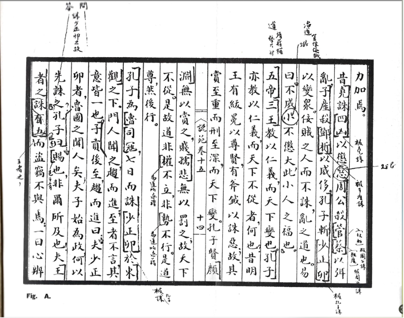 第三,钩标目注。这是流程中最关键而又最具挑战性的一环。先由两位编辑在各自的文本上下功夫,再由第三位编辑和他们协调商定。牵涉到三个问题:(甲)读者若知道文本中有哪些异文,往往可帮助他们了解内容,异文本身也有学术价值。一般古籍将异文在书后列出,我们所用的《说苑》版本则在另一册上,都不注明异文在文本的哪一页出现,在文本上也没有标志。我们提供读者的引得,附有加入标点符号重新排印的文本,遇上异文,就在文本上加注脚。若相关字眼被选入引得,在该录中也把异文的信息纳入括号里。(乙)传统古籍是没有标点符号的,编辑须把文本读通,明白作者的原意以及文中指涉的名物制度,才能够正确地断句。我们的编辑都是受过学术训练的大学毕业生,但每天都遇到一些怎么读都无法读得通的段落,若寻专家请教后仍无法读通,只好把这些段落列出,希望后人有所发现。标点的同时,编辑们随手做些笔记。如书上提到人物往往不用姓名,而用该人的字或号;而有些地方有两个不同的名称,都须顾及。幸而编纂处现在就设在燕京大学图书馆里,用各种参考书很方便。(丙)文本断句后,就可钩标出引得的目注,决定须不须和另一目注互见等等。我影印了经我们钩标后的《说苑》卷十五第十四页(见图一),上面的校对符号与西方用的大同小异。我们的编辑对西方引得的操作很熟悉,什么东西值得重见于引得中以供读者寻检,中西方的原则是一样的。
