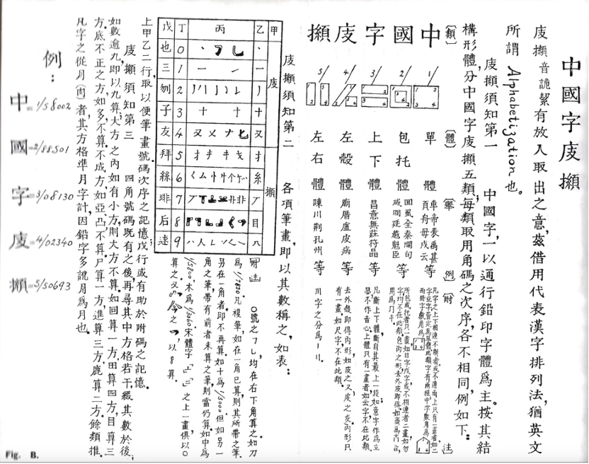 第六,编码。把卡片按次序排列,令读者可按次序便捷地找到有关段落。然而顺什么次序呢?这就是为中文书编引得最棘手的问题了。汉字不似英文字用字母拼成。英文有二十六个字母,可轻易地顺着惯常次序排下去,不懂发音不懂意思都可依序做。汉字没有简单的惯常次序。历来字典不是依诗韵排列就是依二百十四个部首排列,引发的麻烦众所周知。我十一年前便开始思虑如何解开这死结,所以一直关注他人这方面的努力,其中以上海商务印书馆王云五先生的四角号码最成功,但我认为用它来编引得仍不理想。我把自己的方法称为“中国字庋撷”,比起王先生的方法对初学的人来说更容易记,替一个字编码只须三个步骤(见图二),而且几乎每一个号码只有一个字,排列起来又较整齐,这对引得来说是相当要紧的。目前有多所图书馆已用王先生的方法编目录,所以我对要不要推广自己的方法相当犹豫,最终仍坚持用它编引得是因我深信这方法有许多优点,而没有相应的缺点。C. C. Wang去年在Chinese Political and Social Science Review(《中国社会及政治学报》)指出汉字电报码有种种问题。庋撷法几乎每一个号码只有一个字,也许亦可解决电报这个问题。言归正传,所有与“孔子”有关的目注自然都应放在“孔子”这一条录下。我们替“孔”和“子”编了码,便可依码把该录排列在他录之间。该录下所有的目注也可依码排列。若某目注在文本中多处出现,则依其在文本中出现的先后排列。我们有个“号片柜”,每个汉字的庋撷号码都写在一张卡片上,并注明该字的各种发音(用韦氏拼音法),依号码排列。替一部书编引得时,助理甲替一条录编码后,助理丙和助理丁便参照“号片柜”卡片上的汉字校对,以防有失误;之后把“号片柜”的这张卡片放在一旁,待下个步骤使用。