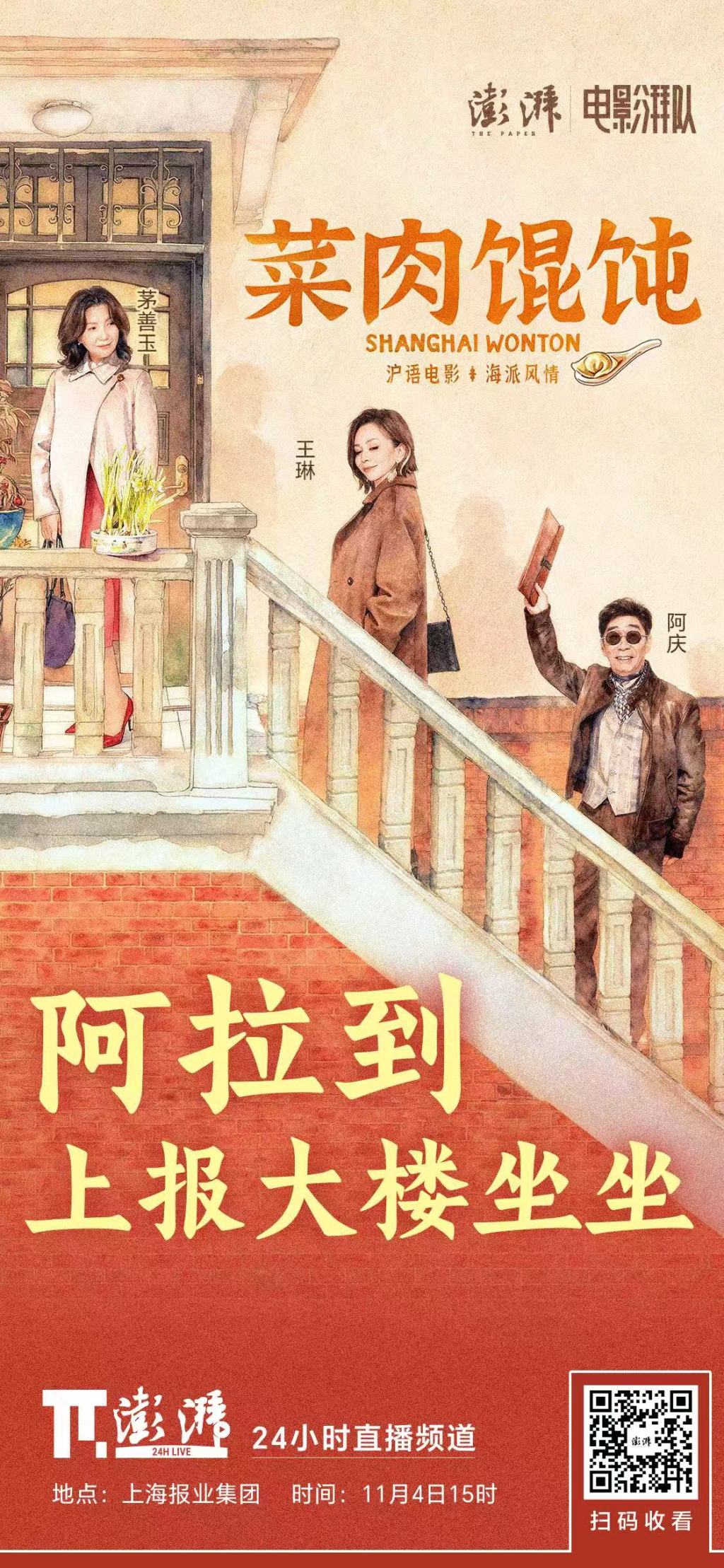 还在等《菜肉馄饨》上映解馋?还在好奇电影里那口“老上海味道”是怎么拍出来的?澎湃新闻推出全新观影团“电影湃队”特邀相亲角金牌三人组茅善玉、陈国庆、王琳来“站队”,11月4日15:00,三位主演及导演吴天戈,制片人顾晓东将来到上海报业集团来“扫楼”!澎湃新闻客户端及微博直播同步开启,陪侬唠嗑,剧透、互动、送福利。