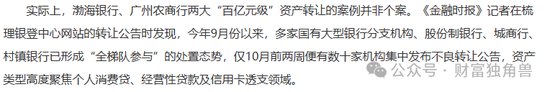据《金融时报》报道,今年9月份以来,多家国有大型银行分支机构、股份制银行、城商行、村镇银行已形成“全梯队参与”的处置态势,仅10月前两周便有数十家机构集中发布不良转让公告,资产类型高度聚焦个人消费贷、经营性贷款及信用卡透支领域。
