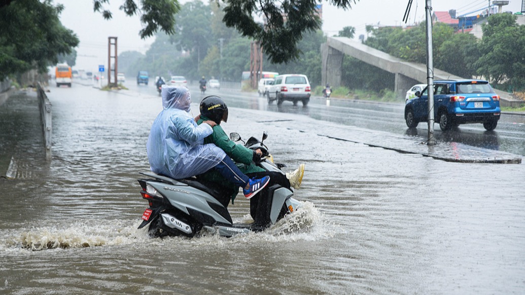 当地时间2025年10月30日,尼泊尔拉利特布尔,持续降雨导致环路区域积水,车辆涉水行驶。视觉中国 图