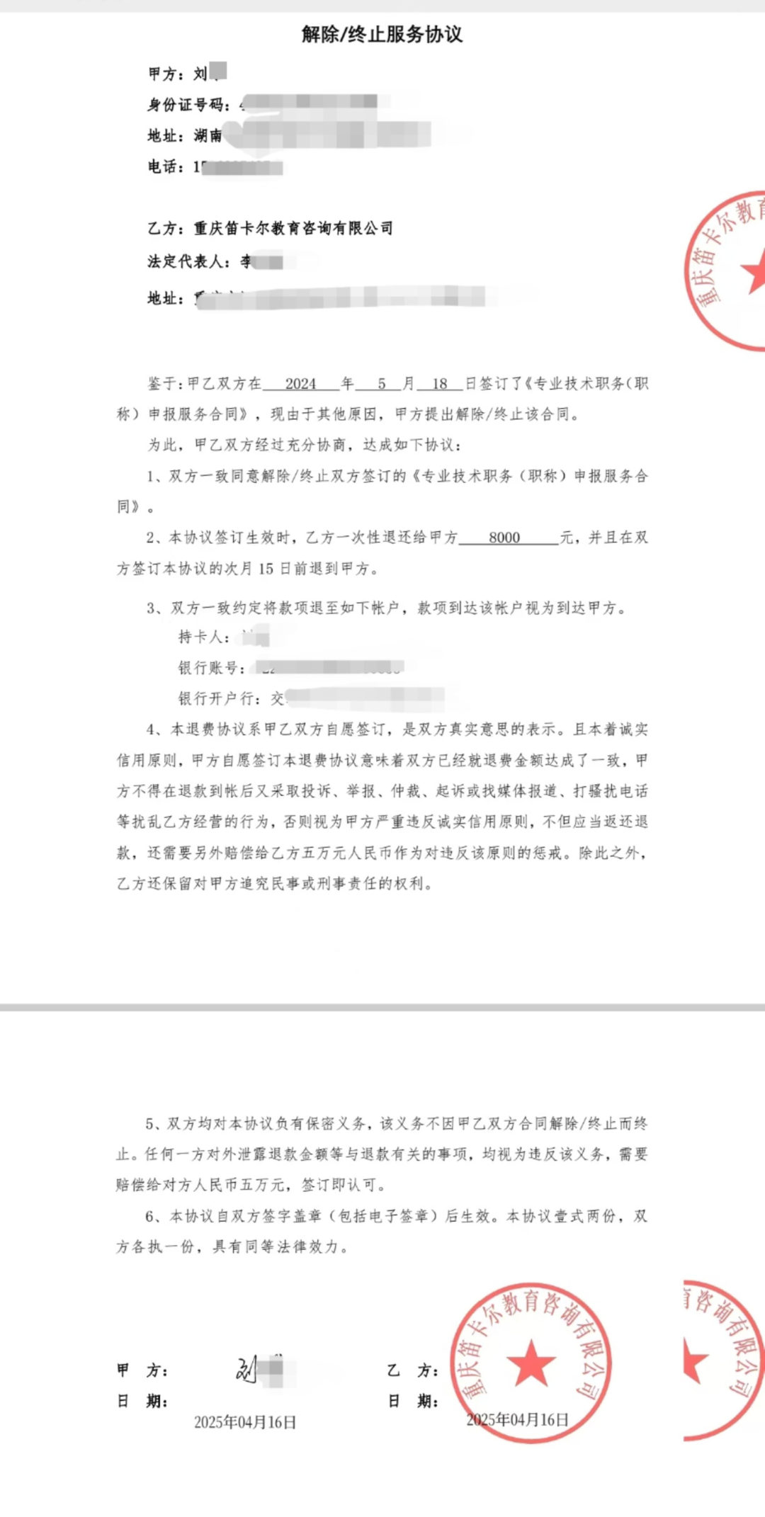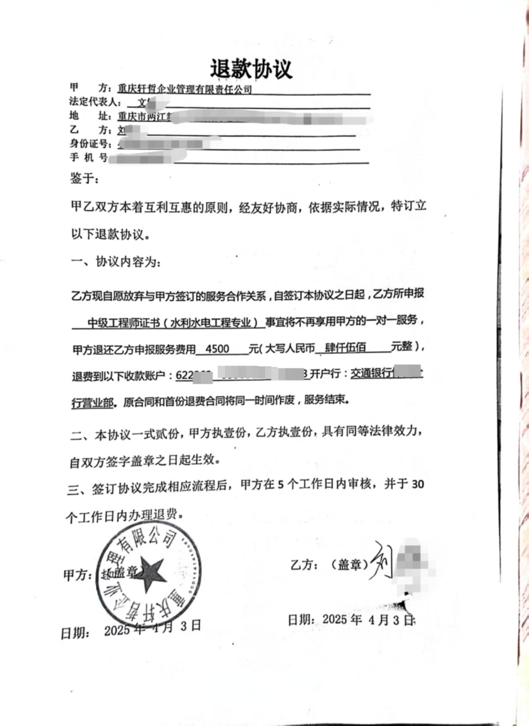 反复交涉后,两家公司于2025年4月与刘先生签订退款协议:轩哲公司承诺30个工作日内退还4500元;笛卡尔公司约定5月15日前一次性退还8000元。