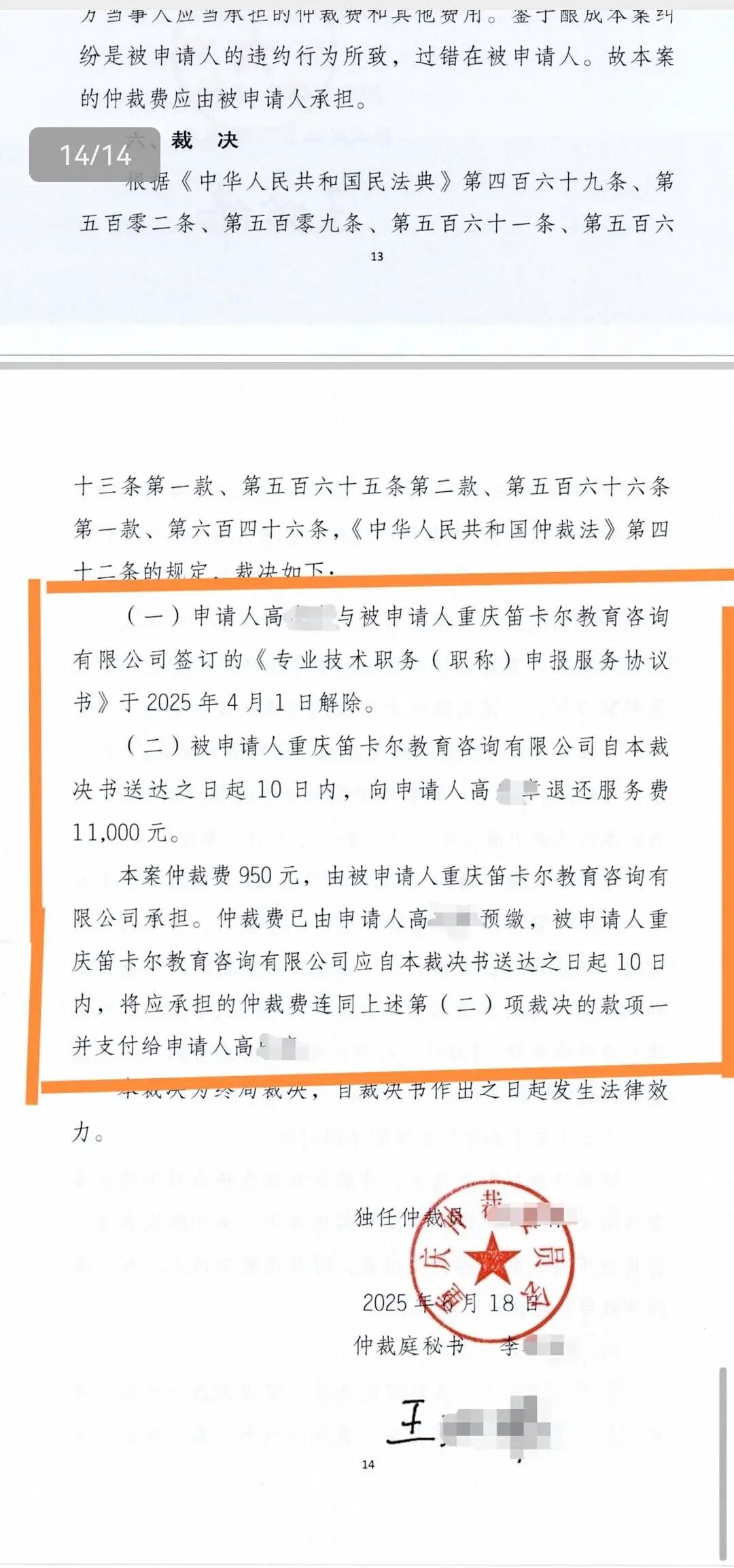 山西的高先生则已走完仲裁程序。2025年6月18日,重庆市仲裁委员会作出裁决,解除其与笛卡尔公司签订的《服务协议书》,要求笛卡尔公司自裁决书送达之日起10日内,向高先生退还服务费11000元。