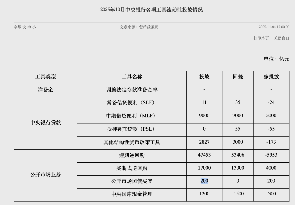 11月4日,中国人民银行公布的2025年10月中央银行各项工具流动性投放情况显示,10月通过公开市场国债买卖投放200亿元,净投放规模为200亿元。