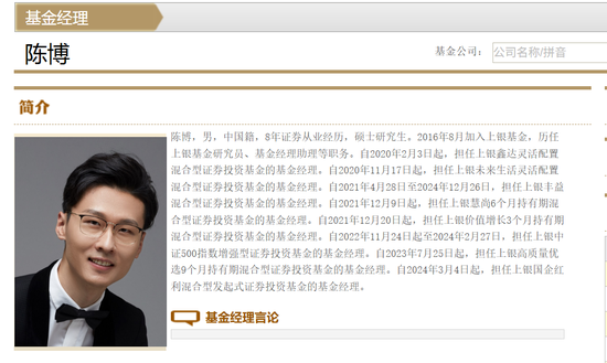 公开信息显示,陈博,男,中国籍,8年证券从业经历,硕士研究生。2016年8月加入上银基金,历任上银基金研究员、基金经理助理等职务。自2020年2月3日起,担任上银鑫达灵活配置混合型证券投资基金的基金经理。算下来,陈博在上银基金有5年多的基金经理从业经验。
