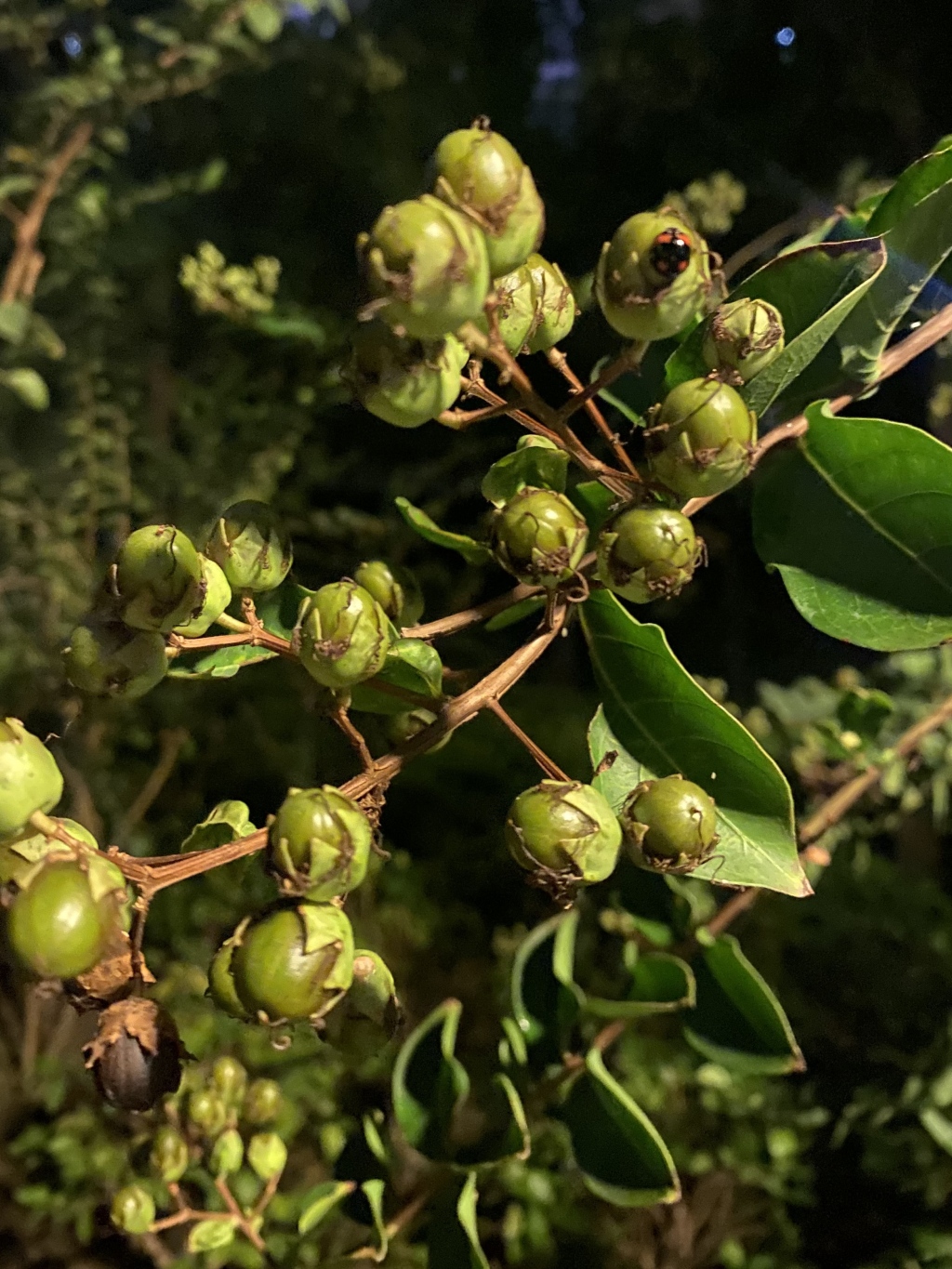 晚上散步,忽然看见口袋公园里的小树上结着累累小青果,比荆棘果略大。我在记忆库里拼命搜索这是什么树,想起来了,这不是紫薇吗?这一大片都是紫薇啊。刚过去的长夏,紫薇花开得绚烂而热烈。只是我从未想过它们还会结果。