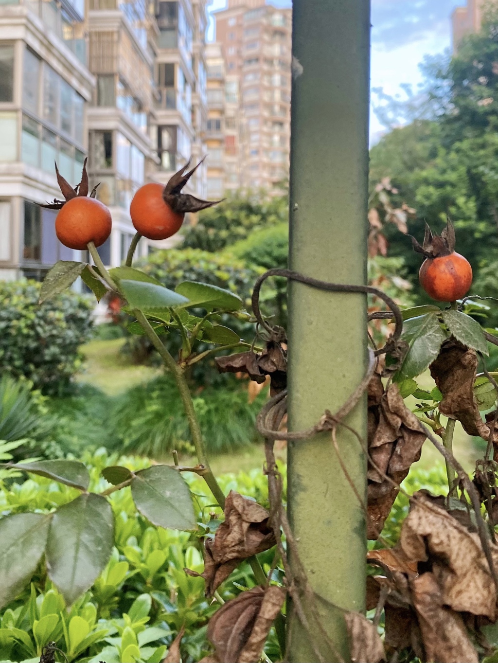 小区栅栏内种的是蔷薇。春天时,一枝枝蔷薇探出头来,像一张张粉面含春的脸,好像在说,看我呀,快看我呀。最近路过这里,发现它们结着一颗颗红红的果实,宛如微小版的石榴,精致而美丽。继续走,看见更多的蔷薇果挂在枝头,在枯枝叶的衬托下似一个个小精灵。要是折一枝插在一个古朴的花瓶里,定会像一阙宋词。
