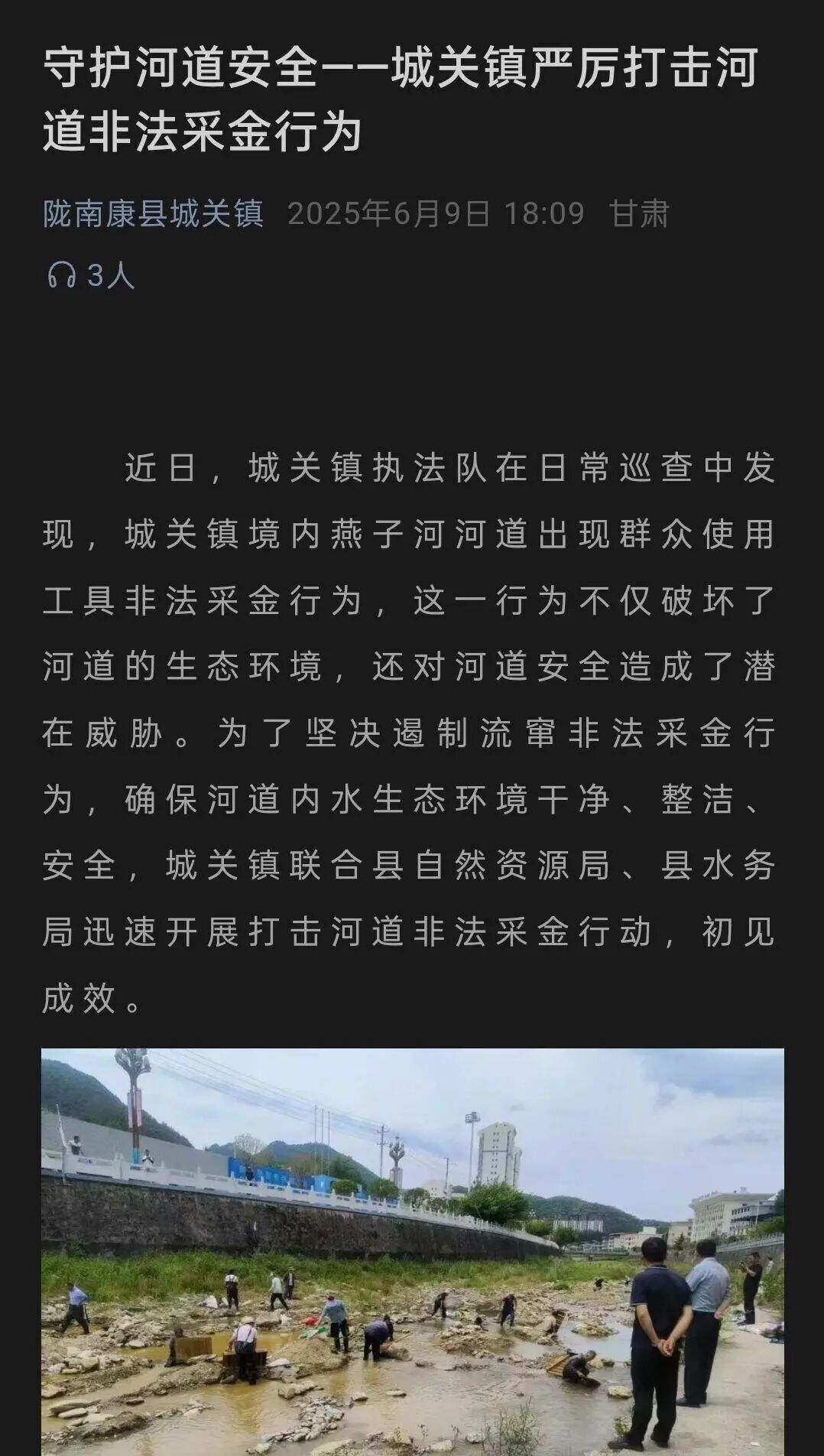 康县城关镇公众号曾发文《守护河道安全——城关镇严厉打击河道非法采金行为》