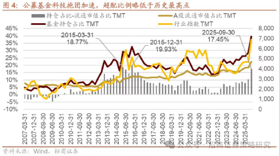 今日A股延续4000点以下的震荡态势,TMT板块仍在回调。从景气度结构上看,我们仍然认为,在四季度缺乏政策对冲的假设下,具有景气度的板块还会聚焦在AI链+反内卷板块,难以扩散至大消费;关税扰动退坡后,出口链及全球定价商品或也有机会。从筹码角度看,Q3公募基金对于TMT板块的配置达到了40%的历史新高,后续上涨或将放缓。表示,尽管国内AI算力龙头的业绩增速并不低,但从股价表现看,其仍未达到市场的预期:参考21年新能源行情,超预期程度的下行与股价自高点下行较为同步。此外,市场对美股科技巨头产生了新的思考,Q3业绩分化下,投资者不再仅仅关注资本开支指引,而考虑了投资后的回报水平,如META和微软都出现了一定程度的下跌。