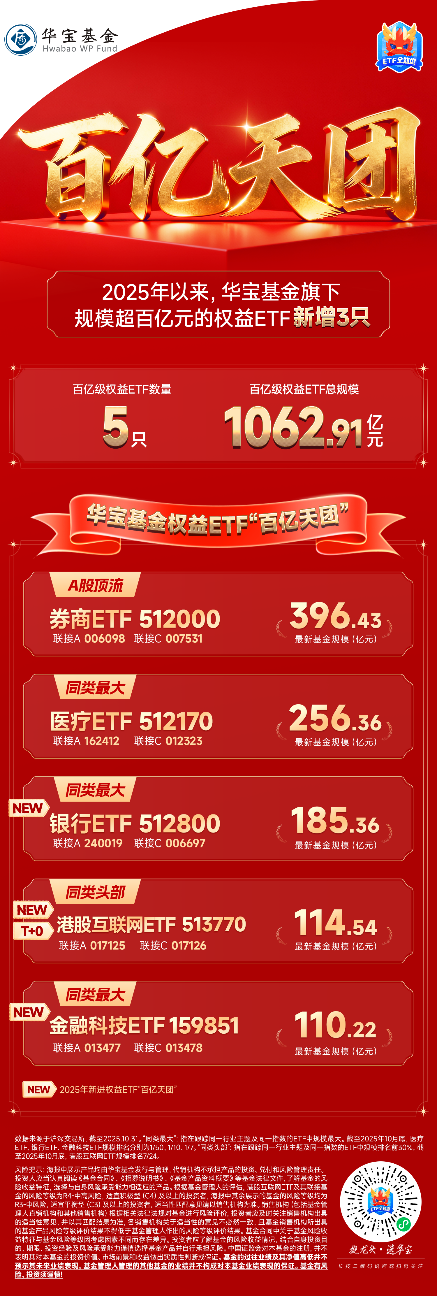 2025年,银行ETF(512800)、金融科技ETF(159851)、港股互联网ETF(513770)这3只热门ETF,基金规模先后升破100亿元大关。由此,华宝基金旗下跻身“百亿ETF俱乐部”的股票ETF数量增至5只,5只股票ETF的基金规模合计高达1062.91亿元。(数据来源:沪深证券交易所;时间截至2025.10.31)