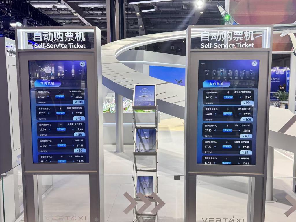 展台外围最先抓住人们眼球的,是两台自动购票机。在屏幕上,用户可以在选定出行日期后选择市内航班或跨城航班,对应不同航线显示起终点、起落时间、票价等信息,选中后可以在机舱五个座位中选座购票。