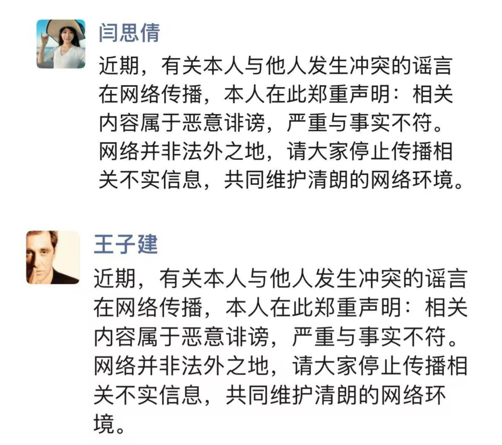 对此,闫思倩与王子健当日晚间分别在朋友圈澄清称,“近期,有关本人与他人发生冲突的谣言在网络传播,本人在此郑重声明:相关内容属于恶意诽谤,严重与事实不符网络并非法外之地,请大家停止传播相关不实信息,共同维护清朗的网络环境。”
