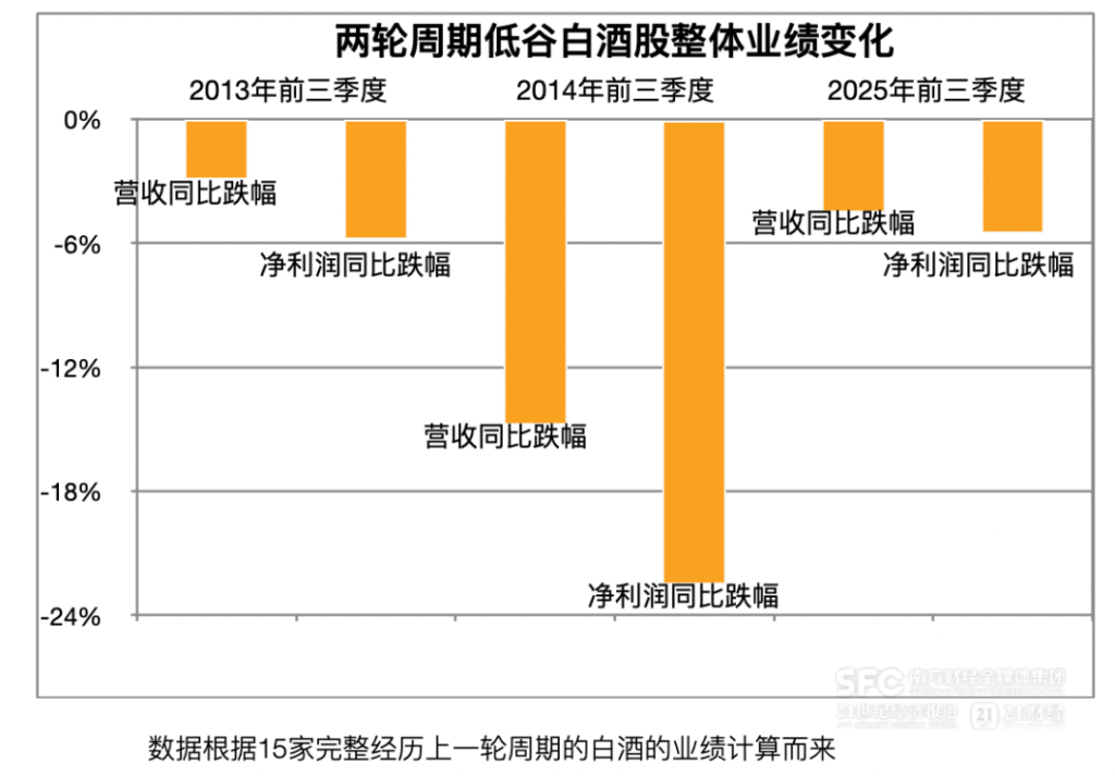 2025年前三季度,这15家白酒的营收、归母净利润跌幅分别是4.5%、5.5%,而上一轮周期低谷的2013年、2014年同期,营收跌幅分别是2.9%、14.8%,归母净利润跌幅是5.8%、22.5%。