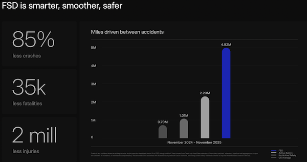 马斯克表示,特斯拉在允许车主边开车边发短信之前会“查看数据”。在股东大会上,特斯拉为了体现其FSD功能的安全性,公布了最新数据,数据显示,在开启FSD功能下,特斯拉车辆每行驶492万英里(约792万公里)才发生一次碰撞,而美国车辆的这个平均水平在每行驶70万英里(约113万公里)发生一次碰撞。据此,特斯拉表示,FSD减少了85%的碰撞。
