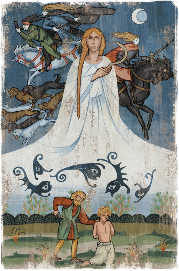 罗马人并非最早在此居住的族人。这片森林里居住着比圣徒更古老的神灵,甚至比罗马人还要古老。早在圣莫里茨踏足塔辛之前,他们就守护着这座城镇。……正是佩尔奇塔(Perchta)和她的狂猎吓跑了那些邪恶的生物。自塔辛建立之日起,他们就一直守护着它。早在罗马人之前,我们的祖先就在一位名叫雷图斯的伟大酋长麾下漫游于这片群山之中。那时的人们远不如现在友善,各个部落为了争夺最肥沃的土地而互相争斗。这位老酋长胆小怕事,无视古老的神祇。他骄傲自大,不愿献祭。正因为他,众神偏爱其他部落,雷图斯的族人失去了属于自己的土地。他们只能在山间峡谷中游荡,狩猎采集一切生存所需的资源。冬天将至的一天,雷图斯外出打猎,发现一只受伤的狼被困在陷阱里。但他没有像大多数人那样杀死野兽,而是帮助野兽,将它从束缚中解放出来。……古神热衷于报答恩惠,而佩尔奇塔是狂猎女神。狼是她的动物。她领导狂猎,而狼则领导森林中的狩猎。在我的时代,人们知道杀死狼会带来厄运。现在,我是唯一记得这些事的人。佩尔奇塔看到了雷图斯的行为,对他表示赞赏,并让狼带领酋长前往她的圣泉。雷图斯带领他的人民来到圣泉,并宣称这里是他的家园,从那时起我们就一直住在这个山谷里。(Ill Peter Gerner, Act III)
