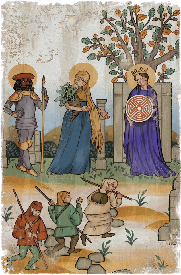 生病的彼得格纳特(“III Peter” Gertner)是塔辛镇上最年长的男人,玩家通过扮演抹大拉可以在病彼得那里了解到这座城镇最古老的创始版本。依据他的口述,塔辛的历史与佩尔奇塔的眷顾有关。这位日耳曼和斯拉夫神话中的人物,其姓名可能意指“明亮”(beraht)或“覆盖”(pergan),她是森林野兽的守护者[8]。原始的狩猎文明使得酋长雷图斯对狼的拯救换来了佩尔奇塔的报答,她将自己的圣泉分享给雷图斯和他的人民以建立塔辛。作为回报,人们向佩尔奇塔献上活人祭祀。这是一个典型的互惠式原始宗教的仪式模型:人的傲慢(拒绝献祭)中断了与神灵的交流——人的善举感召神灵——神灵报答恩惠——人们恢复祭祀以感谢神灵馈赠。基于此,塔辛是一座被佩尔奇塔守护的城市,狩猎采集的生计逻辑与“泉水—土地—果实”的自然循环彼此嵌合,一切生存资源都源于女神的恩惠。