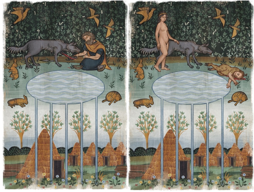 第三,“止杀”与“神迹”的因果连结;正如我们先前提到的那样,佩尔奇塔的故事和罗马版本的第一个故事在情节上几乎是相同的,对于从属于神的动物——狼——的手下留情换来了神灵的报答。而在基督教版本中,“狼”的形象被替换为了同样从属于上帝的基督徒,从而形成了伦理上的类比等值。唯一例外的是罗马的第二个故事,狩猎野猪的杀戮被迫中止却引来神灵更大的愤怒,作为其他版本中幸存者的“狼”在这里化身成了杀死萨提尔的直接施暴者。