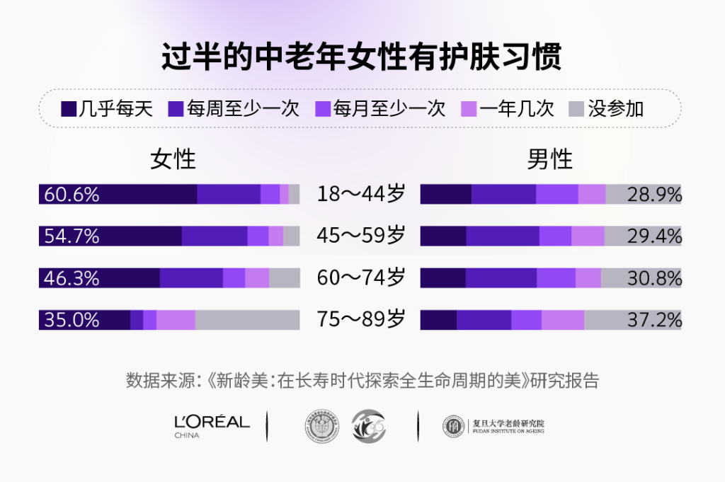 落到行动上,《新龄美》研究报告的调查显示,过半的中老年女性有护肤习惯。日常护肤行为在女性、更年轻、城市居民中的频率更高,60.6% 的年轻女性几乎每天都护肤。有趣的是,45.6%的中年男人每周至少一次/几乎每天护肤,略超过青年男性群体的44.3%。