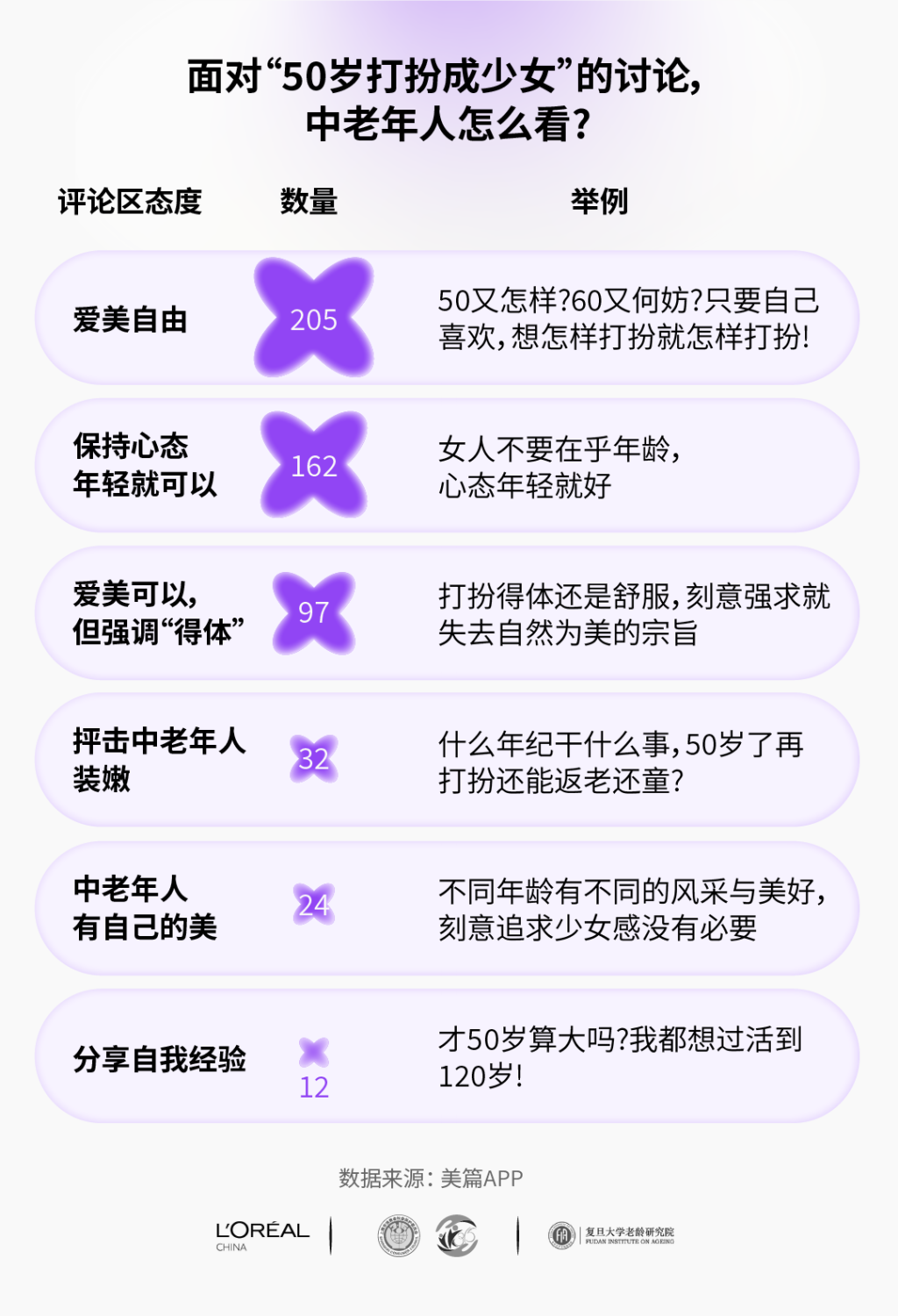 在社交媒体上,中老年人很乐于展示自己的美,也很愿意与他人分享、交流美。在有“老红书”之称的美篇 app 上,她们晒帽子、晒旗袍、晒旅游照片。然而,即使在这种中老年人自己的网络社区里,关于美的年龄束缚也可见一斑。在关于“50岁打扮成少女”的帖子中,评论区的态度不一:有人评论“什么年纪干什么事,50岁了再打扮还能返老还童”?但大多数人表示爱美自由,“只要自己喜欢,想怎样打扮就怎样打扮”。