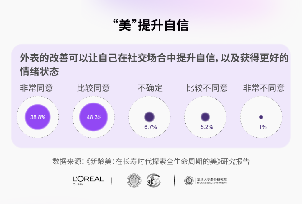 在《新龄美》研究报告的调查中,人们也认可了“美”的现实价值——美既是个体健康的外在表现,也是心理平衡的内在力量。有87.1%的受访者表示,外表的改善可以让自己在社交场合中提升自信,以及获得更好的情绪状态。