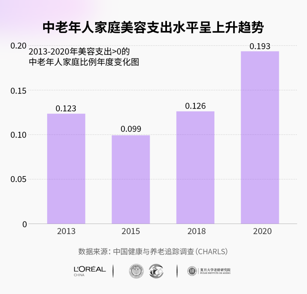 同时,通过对中国健康与养老追踪调查数据(CHARLS)2013、2015、2018、2020年四期的家庭美容支出的分析,可以发现我国中老年人家庭拥有正美容支出的比例从2013年的12.3%稳步增长至2020年的19.3%。