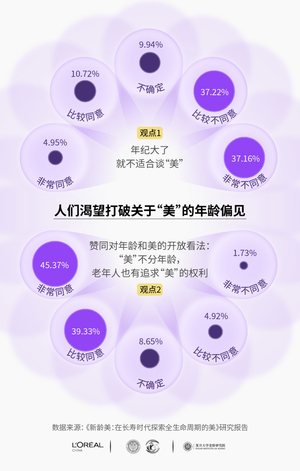 《新龄美》研究报告调研了中国不同年龄段人群关于年龄和美的看法及主要活动参与情况。调查显示,有74%的受访者明确表示不同意“年纪大了就不适合谈‘美’”这一观点。