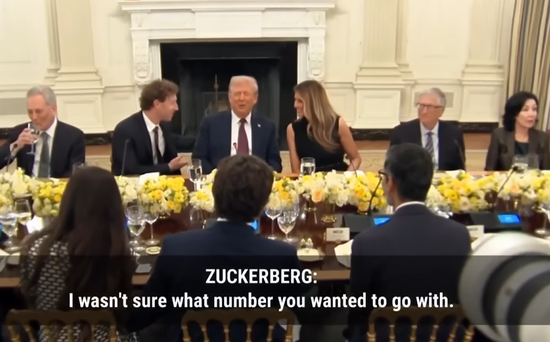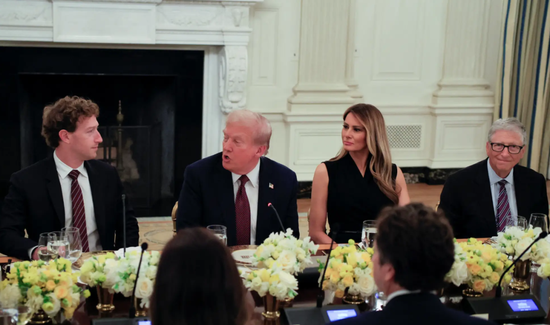 今年9月,美国总统特朗普在白宫设宴招待美国科技领袖,比尔盖茨、蒂姆库克、桑达尔皮查伊、奥尔特曼、纳德拉等科技大佬出席,扎克伯格更是直接坐在特朗普身边。