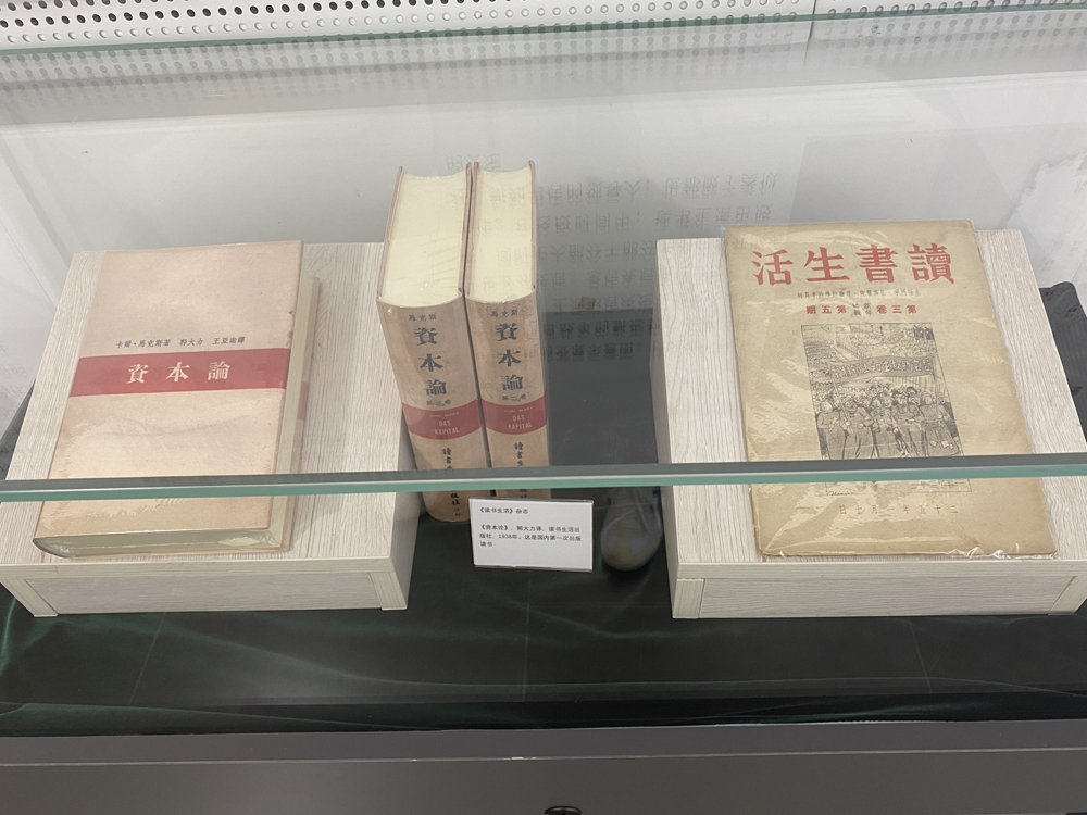 《读书生活》杂志的第三卷、第五期“青年特辑”,以及《资本论》1938年一版一印三卷本实物。 2022年9月,记者王诤摄于北京美术馆东街22号的三联韬奋书店内举办的“庆祝生活读书新知三联书店成立90周年”特展上。