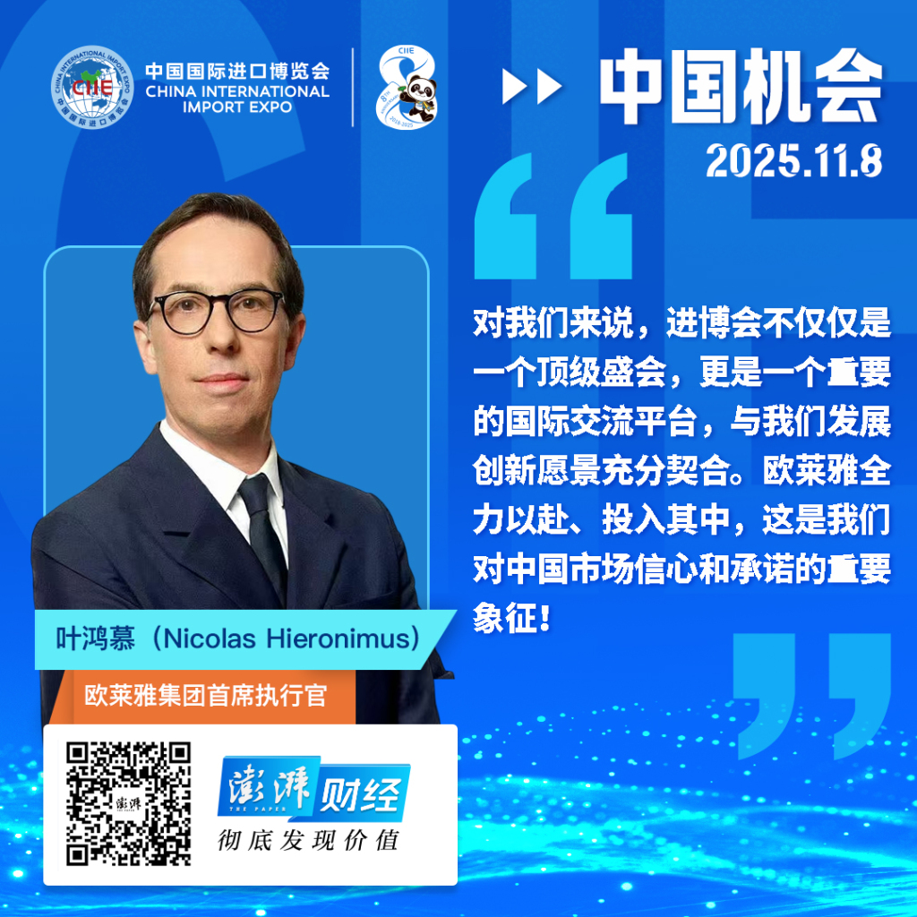 在第八届进博会期间,欧莱雅集团首席执行官叶鸿慕(Nicolas Hieronimus)向包括澎湃新闻在内的媒体表示,今年恰逢欧莱雅中国研发中心成立二十周年,来自中国的深刻洞察、数字化创新以及蓬勃的创新生态圈,正引领未来之美。欧莱雅的信念清晰且坚定,“投资中国,就是投资未来”。
