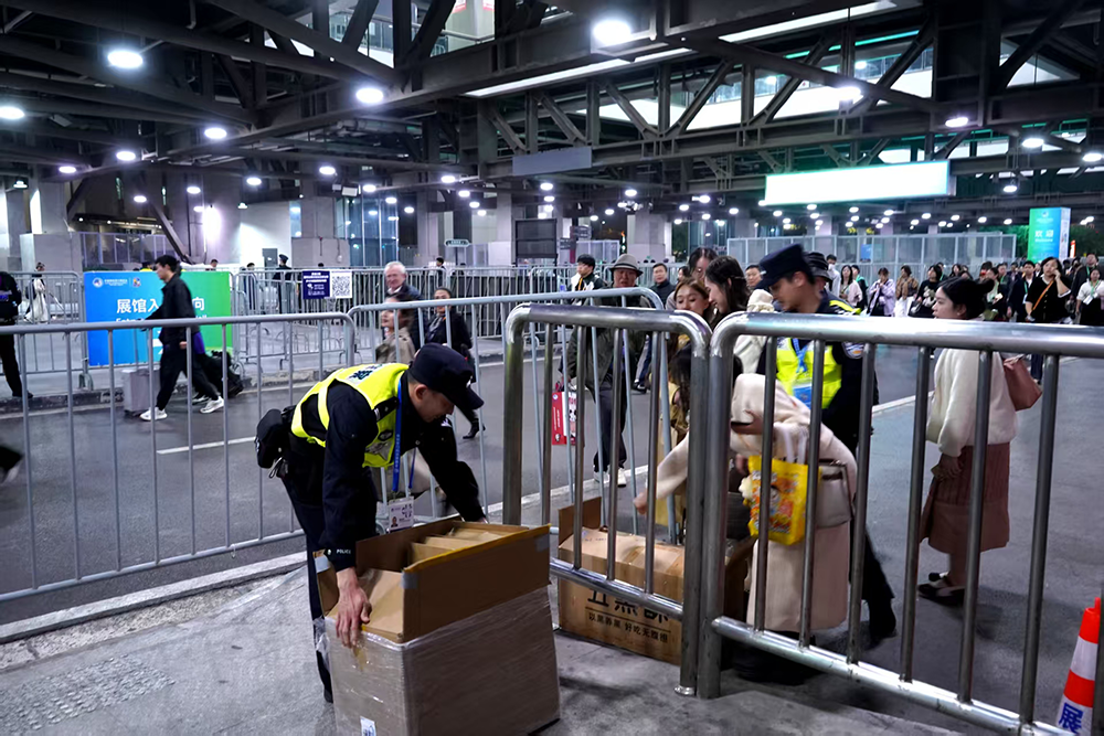 澎湃新闻记者从上海警方获悉,从往日专业观众日分析,每日早上9时至11时是入馆高峰时段,下午4时起会迎来集中离场大客流。由于大部分展客商都会选择轨交出行,西厅0米层便成了最优选择的离场通道。为此,警方将在重点时段持续增派警力加强疏导,同步利用广播系统等方式,实时引导观众有序离场。
