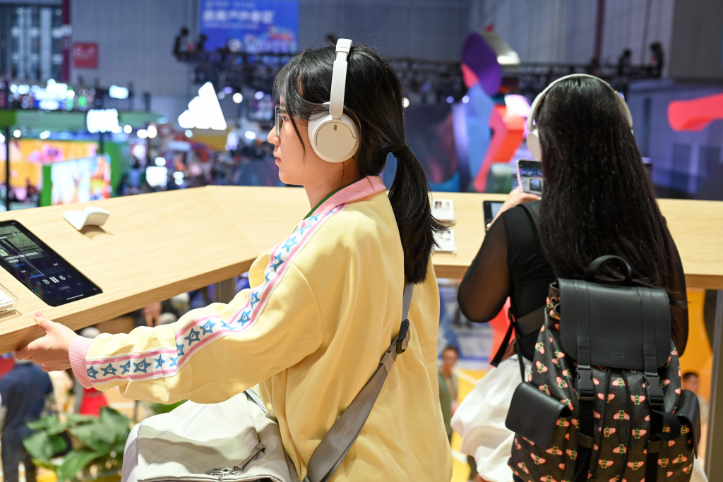 观众在lululemon展台二层《对话好状态》播客区域聆听来自不同领域的嘉宾故事,有“人菜瘾大”的贾玲对运动的热爱,卢靖姗在瑜伽中体验到的身心联结,汪顺在游泳之外的运动之乐,以及今年“世界精神卫生日”期间制作的特别对谈内容。澎湃新闻记者 朱伟辉 图