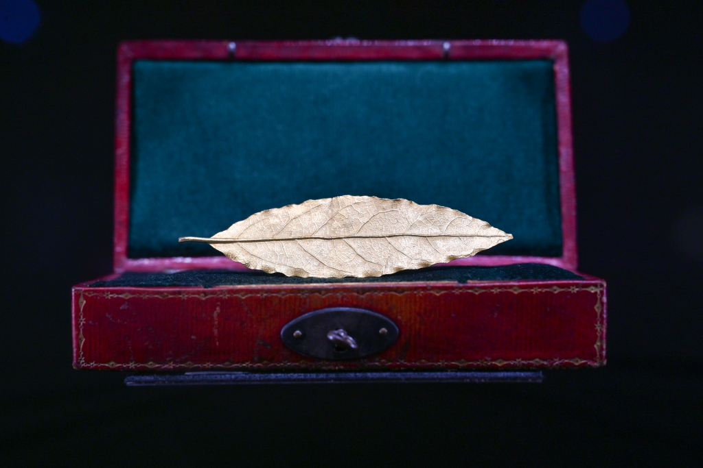 本届进博会上,V MUSE呈现了22件博物馆级历史珠宝珍藏。其中,最为珍贵的要数法国皇帝拿破仑一世黄金月桂冠上的“金叶子”。1804年12月2日拿破仑称帝时,曾佩戴这顶冠冕出席了加冕大典,从此头戴桂冠的形象成为了历史记载中拿破仑的主要造型之一。拿破仑兵败滑铁卢后,这顶月桂冠被复辟的波旁政权于1819年在巴黎铸币厂熔化成一个小金球。目前所知,仅有两枚金叶子存世,另一枚藏于法国枫丹白露宫。澎湃新闻记者 朱伟辉 图