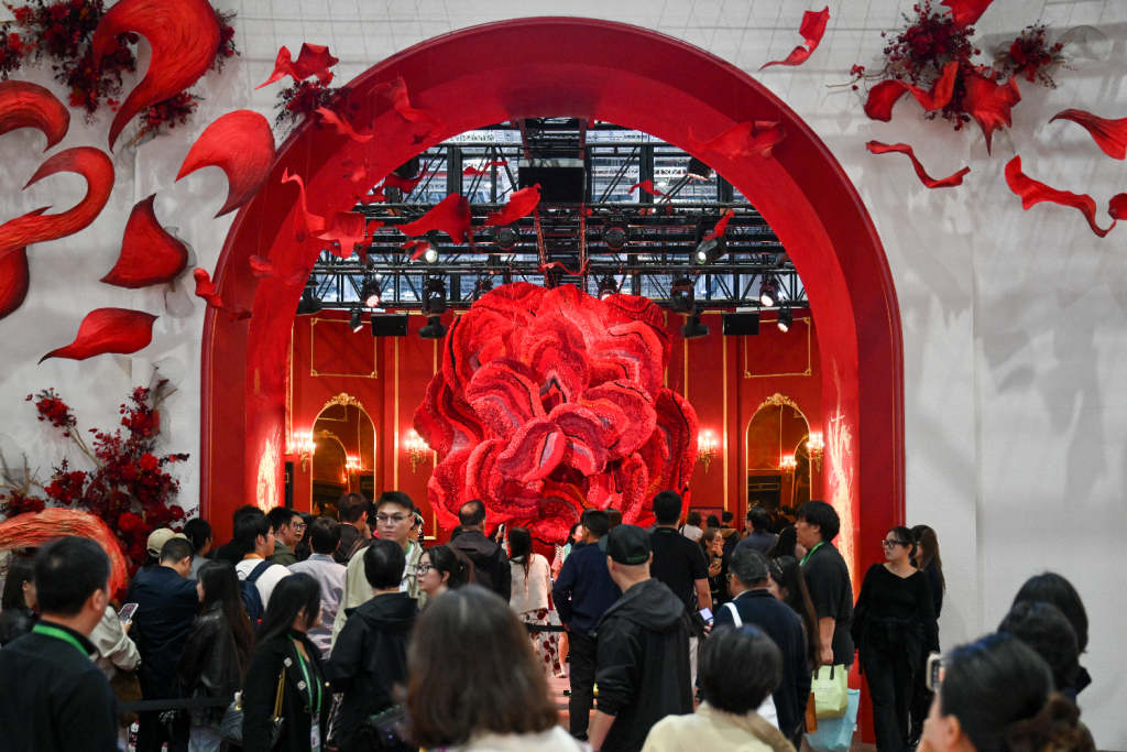 V MUSE展台吸引众多观众。展台中央的巨型花朵,是几十位花艺师花了几千个小时,把真花一点点嵌上去的。澎湃新闻记者 朱伟辉 图