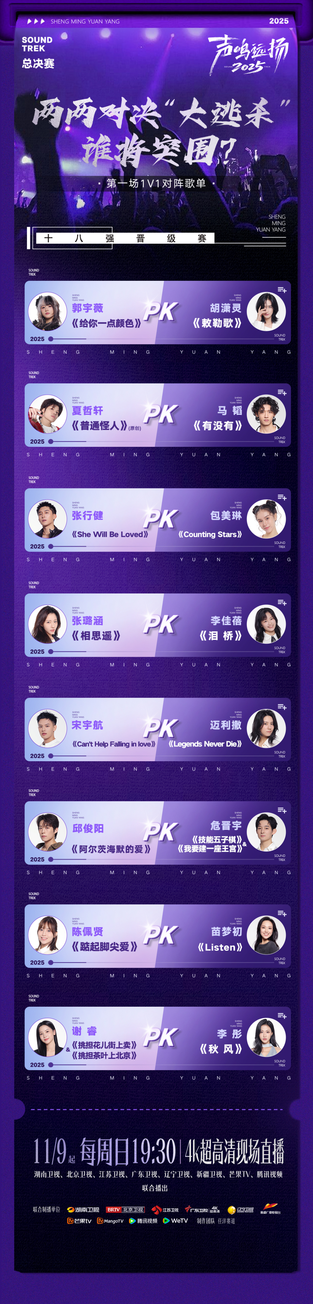 《声鸣远扬2025》总决赛于11月9日起每周日19:30 4K超高清现场直播,湖南卫视、北京卫视、江苏卫视、广东卫视、辽宁卫视、新疆卫视、芒果TV、腾讯视频八大平台联合播出。33位选手从全国六大赛区13000多人中脱颖而出,年轻一代的音乐力量正以放手一搏的勇气奔赴这场凭实力见真章的音乐之旅。
