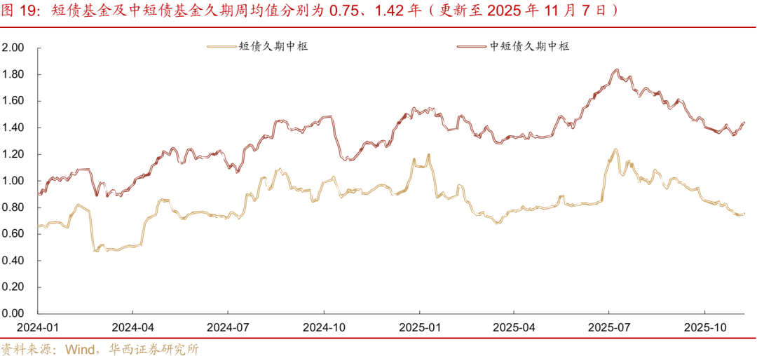 中短债基金久期也开始拉长,而短债基金久期依然持续压缩。其中,中短债基金久期周均值由前一周的1.36年拉长至1.42年,而短债基金久期中枢由前一周的0.76年小幅压缩至0.75年。不过,二者在周内均维持升势。其中,中短债基金久期中枢由周一的1.39年升至1.44年,短债基金久期中枢升幅相对较小,由周一的0.74年升至0.76年。