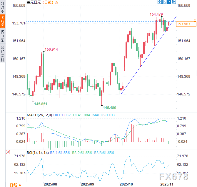周一(11月10日)延续前一交易日涨势,亚市时段震荡上行,上涨约0.37%至153.97附近。