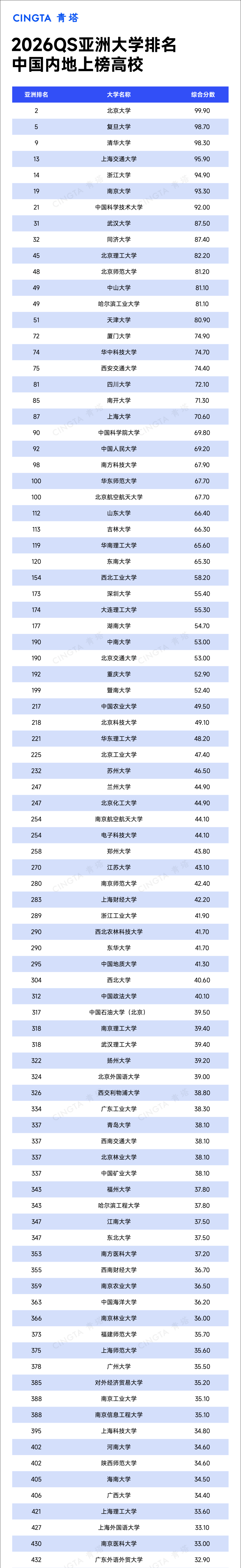 上榜高校名单,请关注【青塔】,或点击下方名片,回复【QS亚洲26】获取。