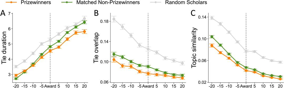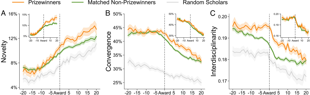 换句话说,获奖者的科研成就本身就具有高创新性,而非依赖奖项资源。由此可以推论:科学奖励系统在识别真正的创新者方面,依然具备一定的有效性。在同等杰出的研究者中,真正推动知识边界的创新者,更有可能脱颖而出并获得奖项认可。