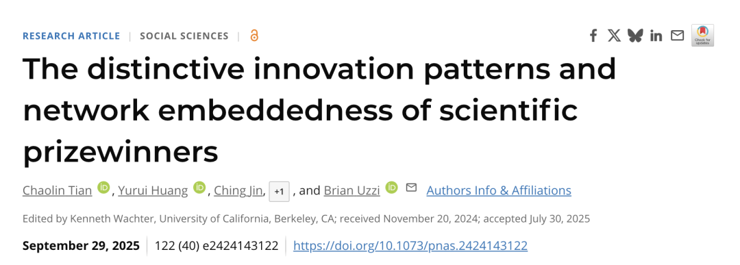 论文信息:C.Tian,Y.Huang,C.Jin,Y.Ma,&B.Uzzi,Thedistinctiveinnovationpatternsandnetworkembeddednessofscientificprizewinners,PNAS(2025).