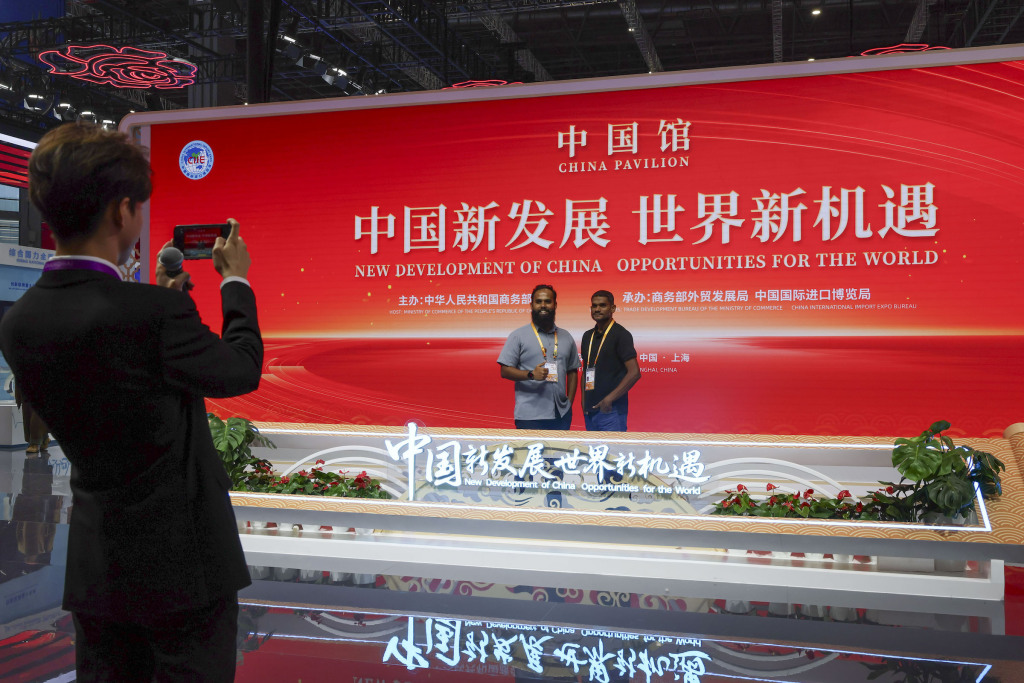 2025年11月10日,外国展商在中国馆拍照留影。 新华社记者 王翔 摄