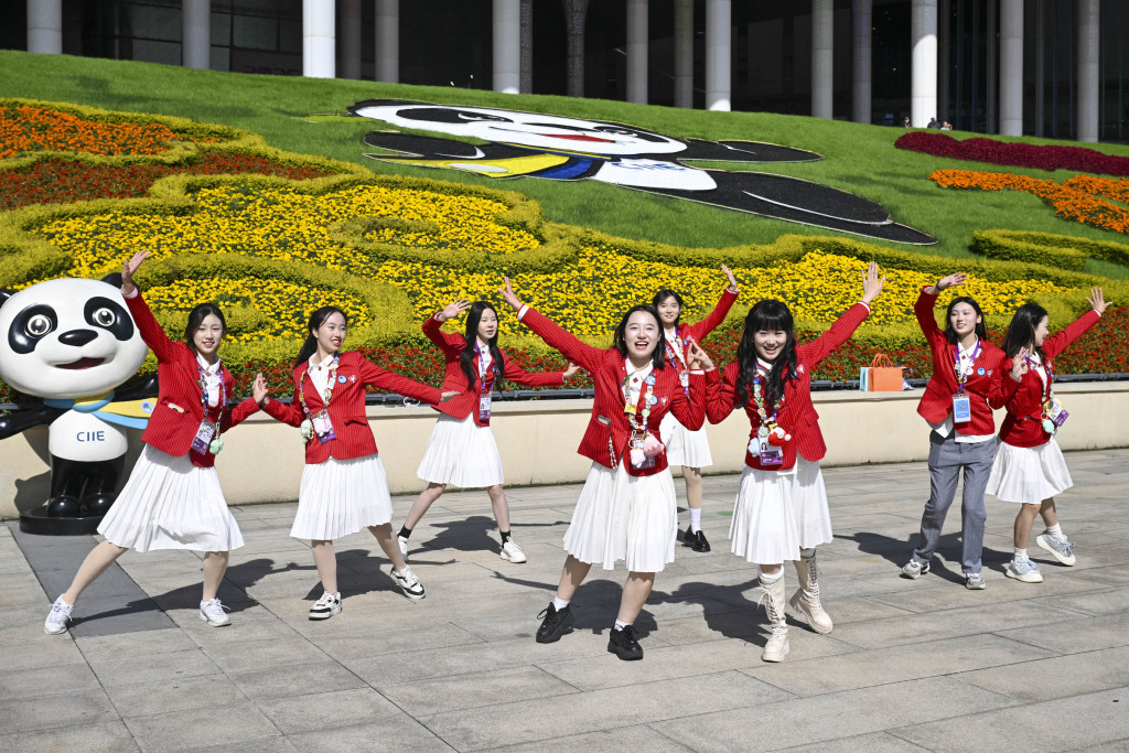 2025年11月10日,志愿者在第八届进博会举办地——国家会展中心(上海)南广场跳舞。 新华社记者 陈浩明 摄
