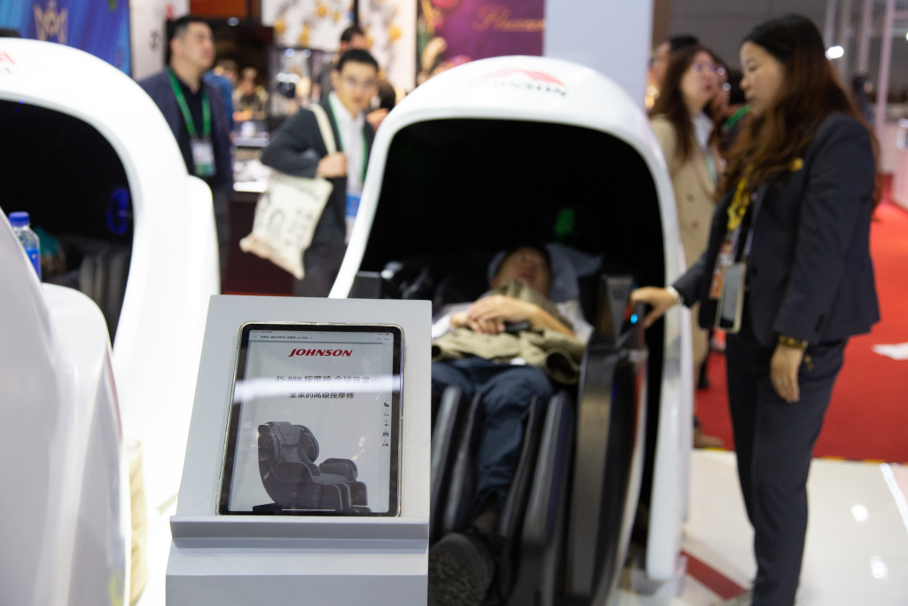 2025年11月6日,在进博会消费品展区乔山健康科技展台,参观者体验该品牌全球首发的按摩椅。 新华社记者 田薇薇 摄