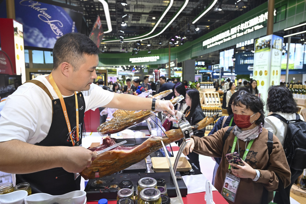 2025年11月5日,观众在第八届进博会农食产品展区大商集团展台品尝进口火腿。 新华社记者 陈浩明 摄