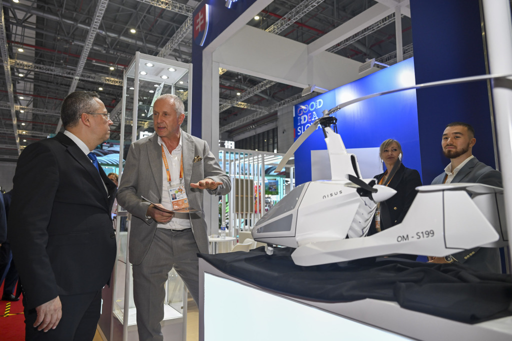 2025年11月5日,在第八届进博会国家展斯洛伐克馆,参展商(左二)在向嘉宾(左一)介绍一款飞机产品。 新华社记者 陈浩明 摄
