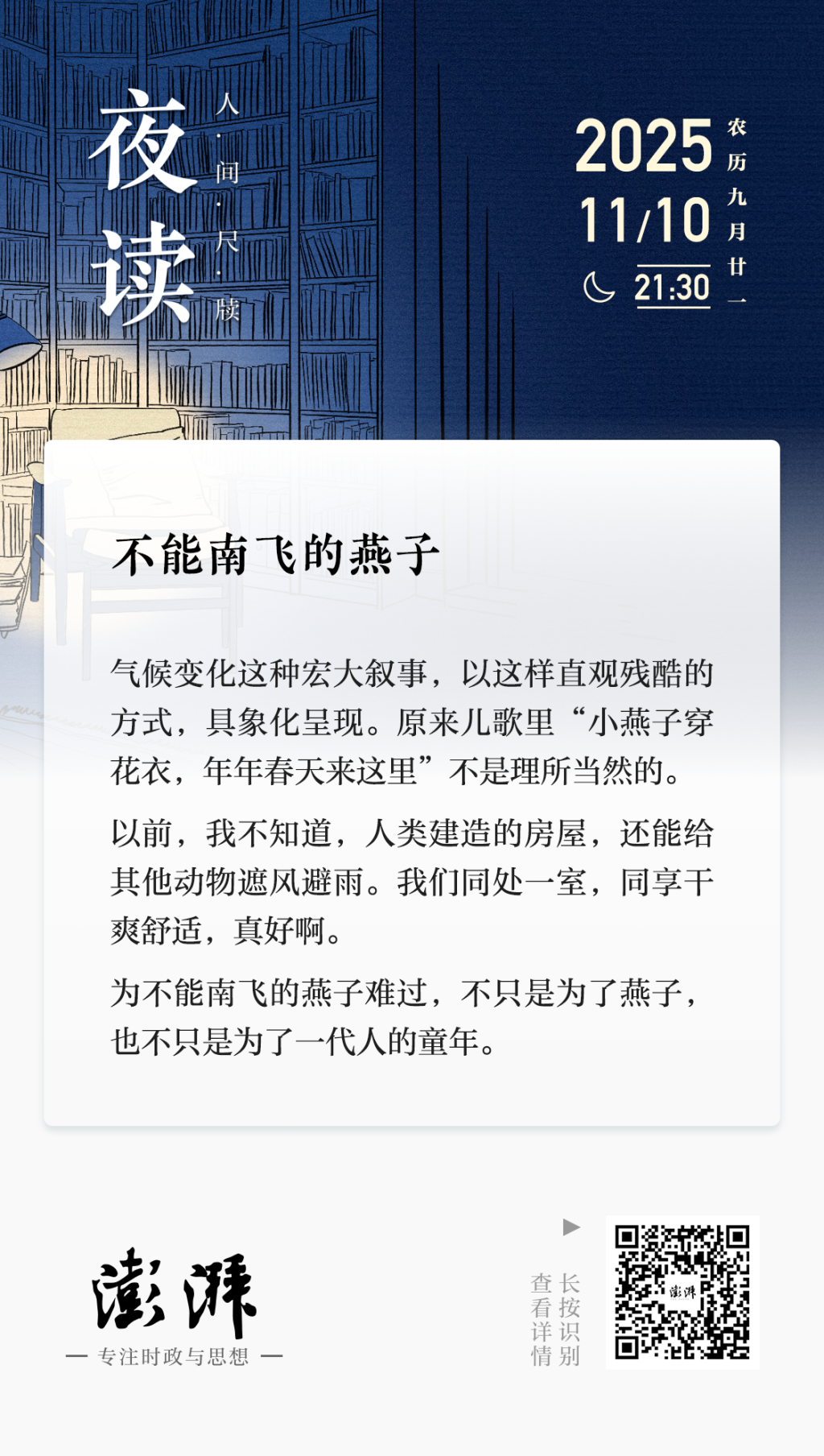 气候变化这种仿佛离我们很遥远的宏大叙事,以这样直观残酷的方式,具象化地呈现在我们面前。有同事在转发燕子视频时,配文:好难过啊。而我第一时间想到的是,原来一代人唱的儿歌里,“小燕子穿花衣,年年春天来这里”,并不是理所当然的事。